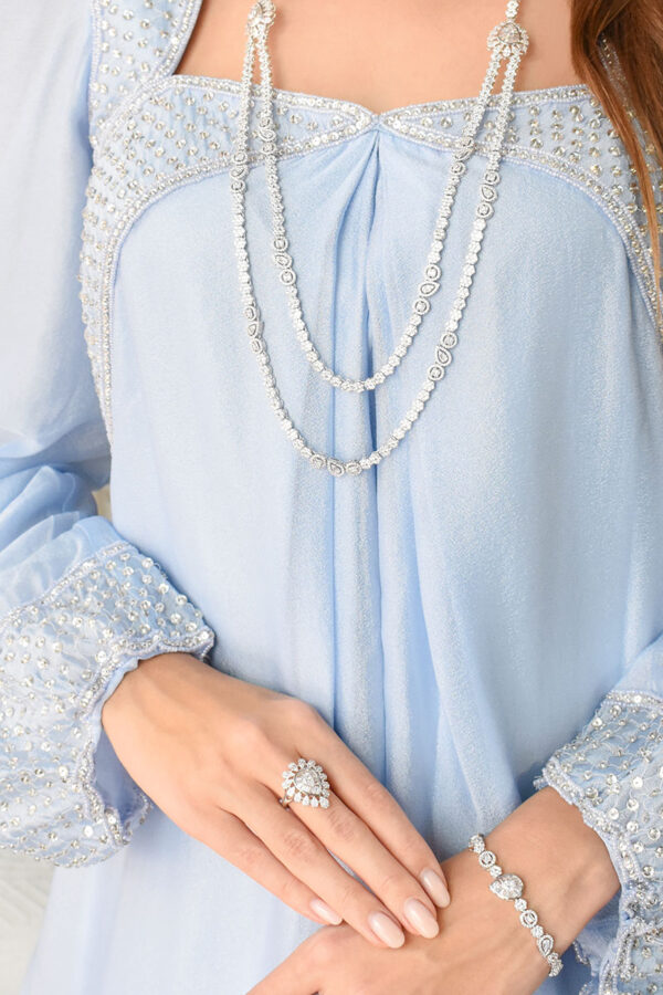 - This beautiful set consists of the Necklace, Bracelet, Ring and Earrings.